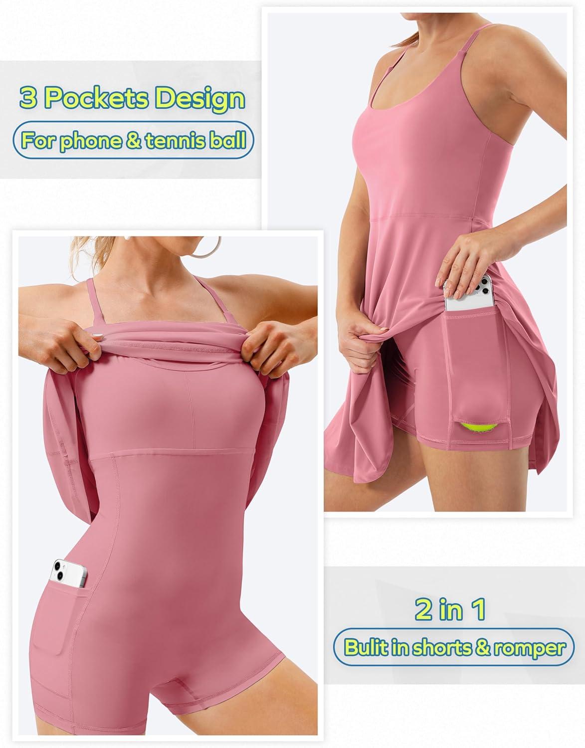 Ewedoos Tennis Dress Womens Athletic Dress Built in Shorts & Bra Adjustable Straps Workout Exercise Golf Summer Dress(Pink)
