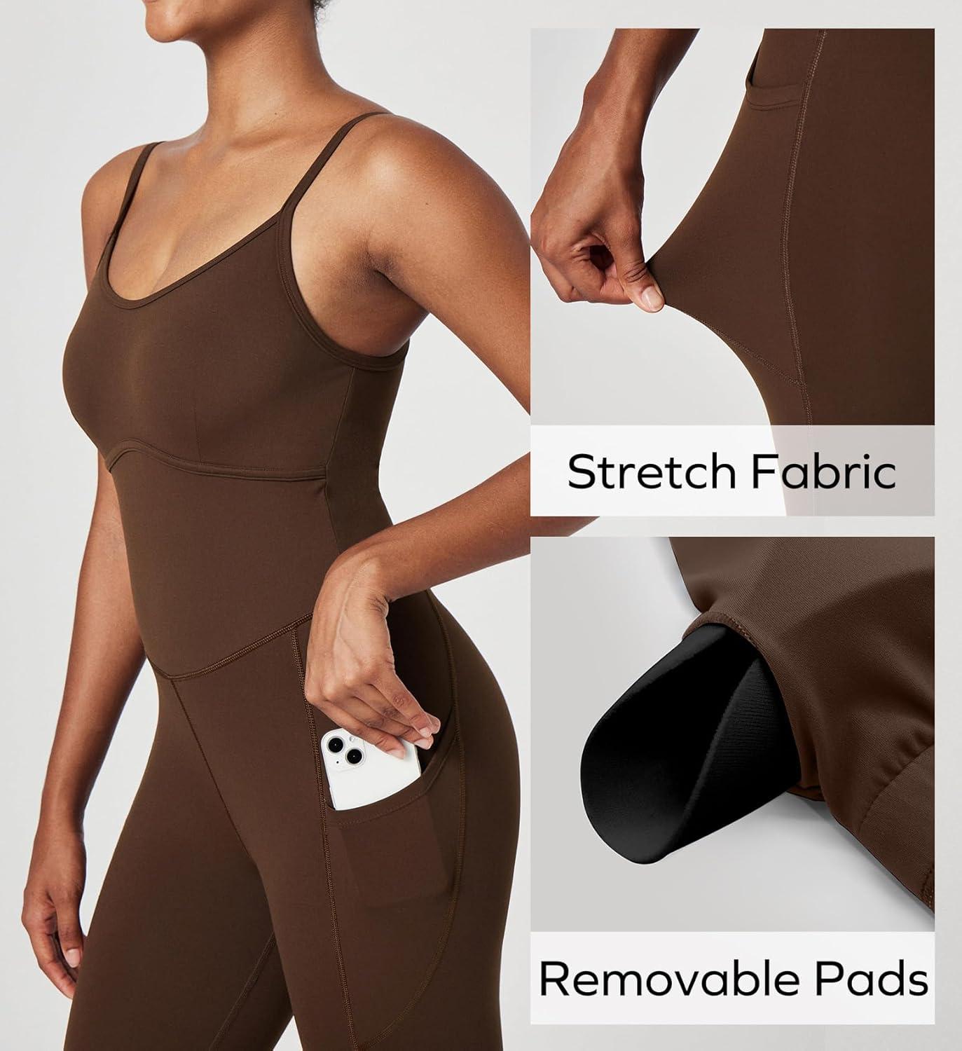 Ewedoos Flare Jumpsuits for Women with Pockets Adjustable Strap Sculpting Bodycon Jumpsuit Unitard Tummy Control Body Suit(Brown)