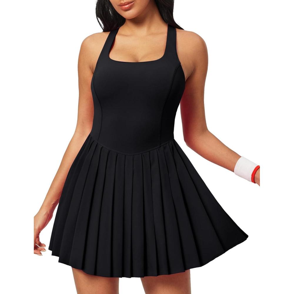 Ewedoos Tennis Dresses for Women Athletic Dress with Shorts Underneath Easy Peezy Pleated Workout Dress with Bra and Pockets(Black Tennis Dress)